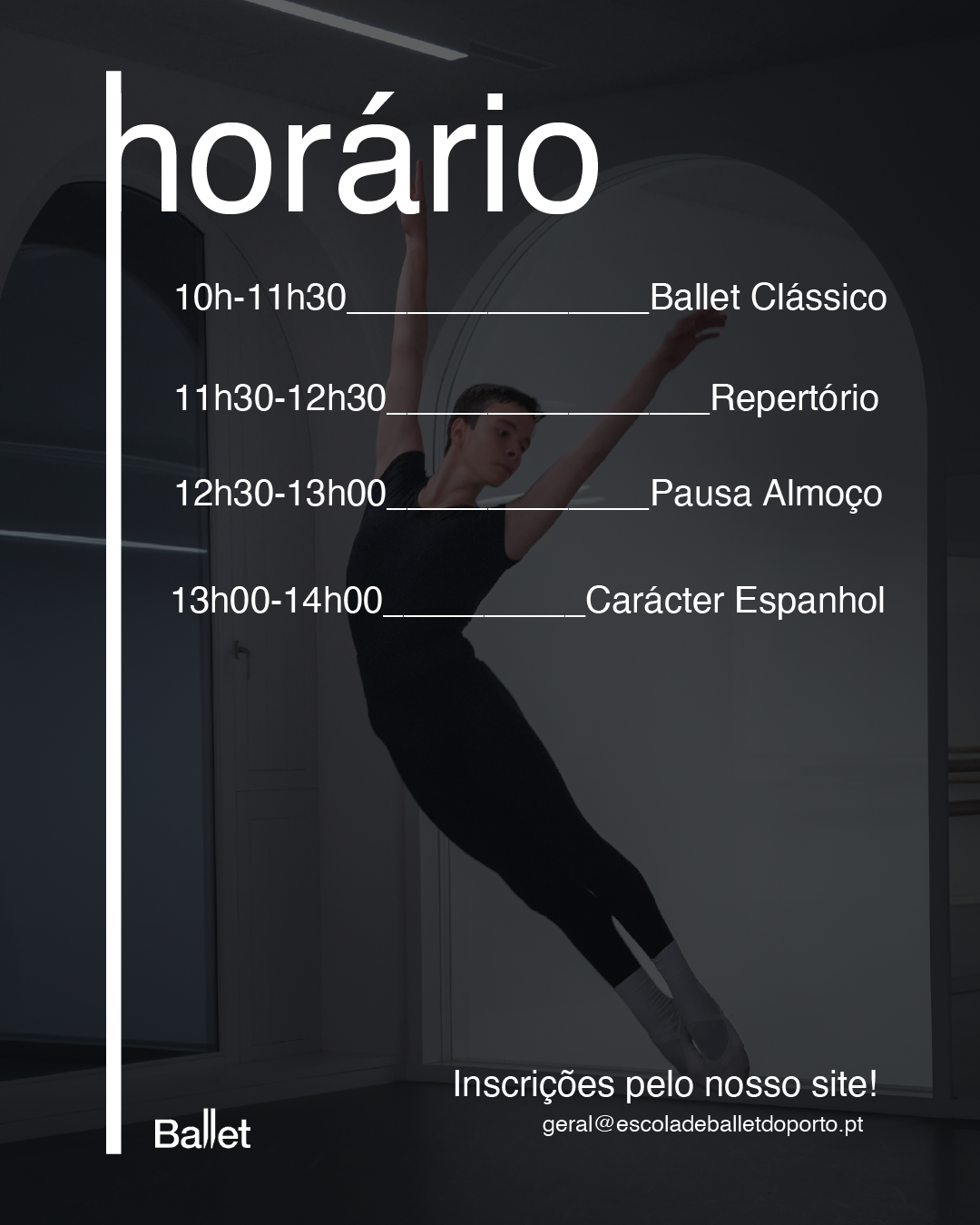 A inscrição só é válida após o pagamento que deve ser feito por transferência para o IBAN: PT50 0033 0000 4543 7859 4780 5. O comprovativo pode ser submetido diretamente no formulário ou enviado para o email: geral@escoladeballetdoporto.pt, devidamente identificado com o nome do aluno.
